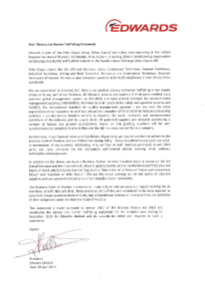 Edwards Vacuum, Part of the Atlas Copco Group, is committed to explicitly ensuring that there is no modern slavery or human trafficking in our supply chains or in any part of our business.